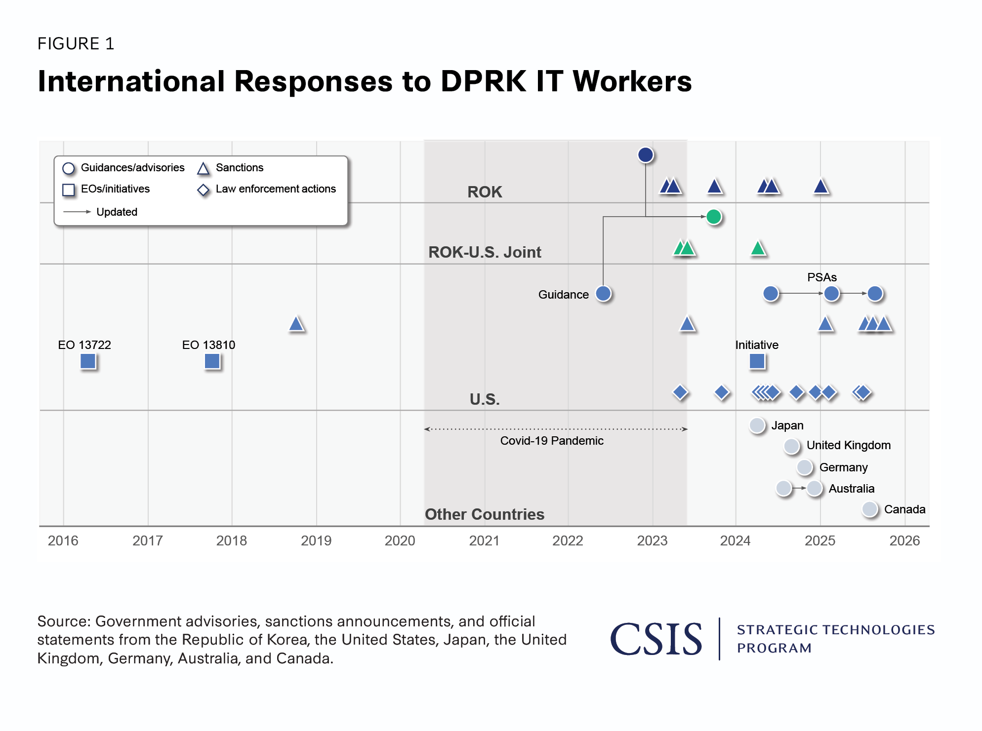 The United States is the primary country where DPRK IT workers are most actively operating, and it has responded with the most robust measures, including various sanctions, to curb their employment activities within the country. As a result, by the second half of 2024, DPRK IT workers shifted their operations primarily to Europe, where oversight is relatively less stringent. Figure 1 summarizes guidance and advisories, sanctions, executive orders (EOs) and initiatives, and law enforcement actions issued by the Republic of Korea (ROK), the United States, and other countries, organized by release date. The figure illustrates that DPRK IT workers have long been recognized by the U.S. government as a serious threat, and the United States has actively responded through EOs, initiative, sanctions, and legal actions.