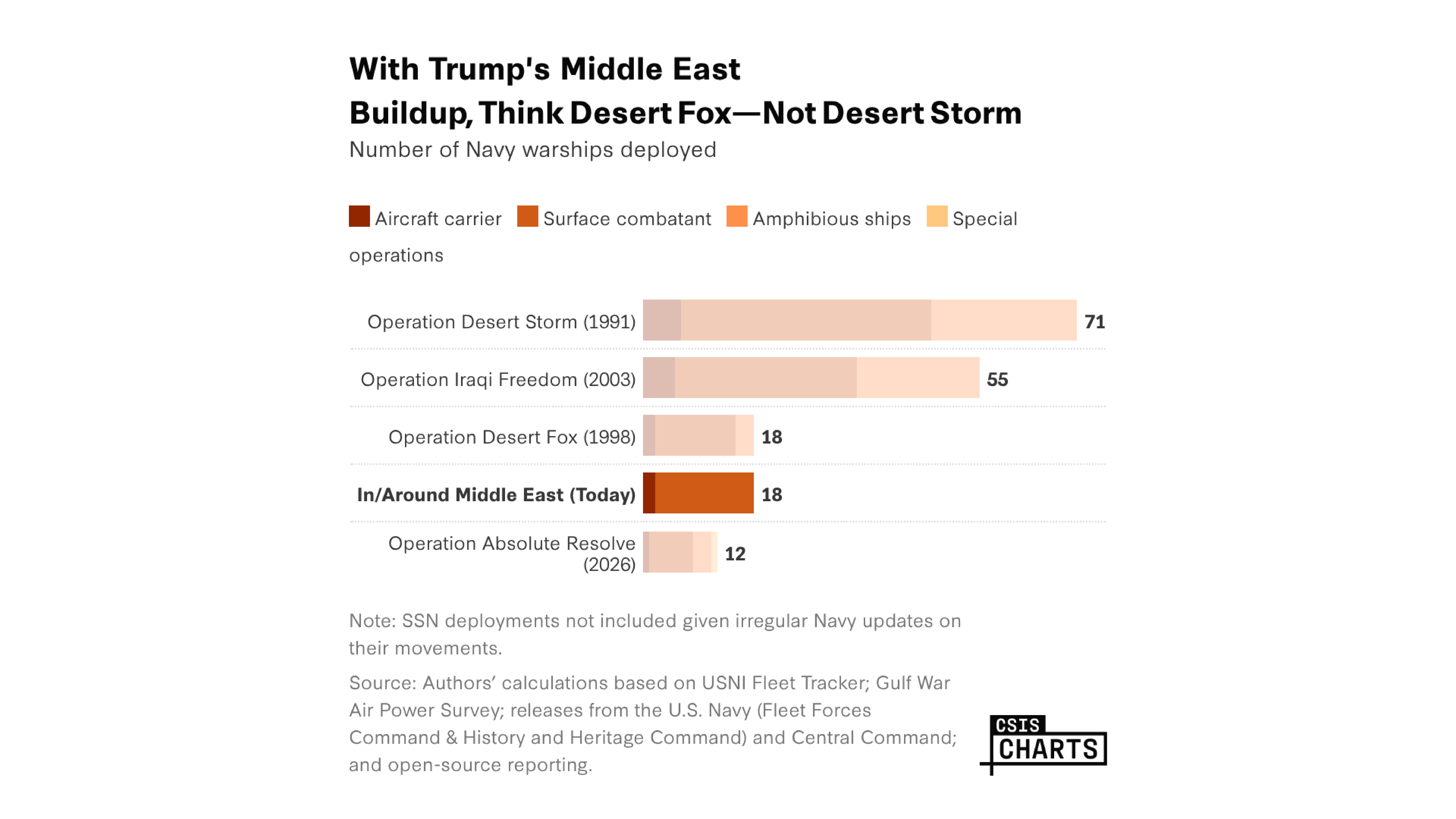 - The current force level is comparable to Operation Desert Fox, the Clinton administration’s punitive 70-hour bombing campaign after Saddam Hussein refused to cooperate with UN nuclear inspectors. Like then, U.S. forces in the Middle East can launch 150–250 Tomahawk missiles and other long-range missiles (e.g., JASSMs) against facilities of the Islamic Revolutionary Guard Corps or Iran’s nuclear program. Israeli airpower might contribute to a punitive campaign.